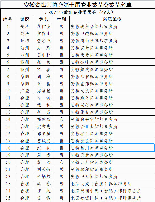 恭祝纪舸律师当选安徽省律师协会破产与重组专业委员会委员