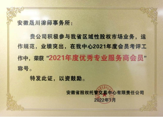 发布人:管理员 发布时间:2022-08-02 浏览次数:近日,安徽晟川律师事务所荣获安徽省股权托管交易中心“2021年度优秀专业服务商会员”。