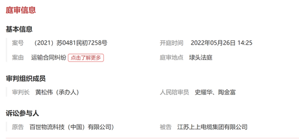 百世物流状告江苏上上电缆,案由系运输合同纠纷