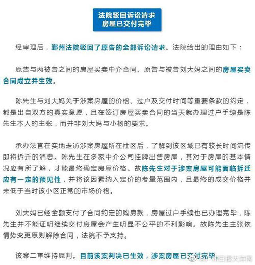 其次,涉案房屋面临拆迁的消息在当地已众所周知,连小区门口的保安都知道了,陈先生作为业主怎么会毫不知情呢?况且我已经将房款全额付清,过户手续也办了,房屋买卖合同已履行完毕。