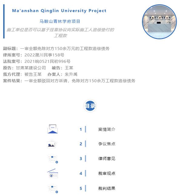 2021年1月,甘肃某建设公司以追偿权纠纷为案由,向王某主张1575130元的工程款及利息。被告王某委托本所朱升禹律师作为其代理人参与了诉讼,一审全额驳回了对方甘肃某建设公司得全部诉请。