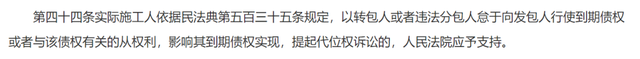 这与《民法典》第五百三十五条保持一致,实际上将“与该债权有关的从权利”纳入了代位权的行使范围,某种程度上为实际施工人在提起代位权诉讼中主张代位行使建设工程价款优先受偿权提供了路径。