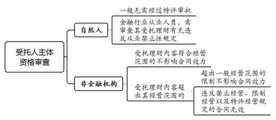 受托人为自然人的情况下,一般而言其受托理财无需经过特许审批,但受托人属于金融行业从业人员时,法院应进一步审查受托人有无违反从业禁止性规定。受托人为非金融机构的情况下,应当进一步对其受托理财的内容及经营资质、主体资格、经营范围等进行审查。若受托人受托理财的内容超出其经营范围,还需进一步区分超出事项的性质:对于超出事项属于一般经营范围的,不影响合同效力;若超出事项属于禁止经营、限制经营以及特许经营的,因受托人违反效力性强制性规定,应认定合同无效。
